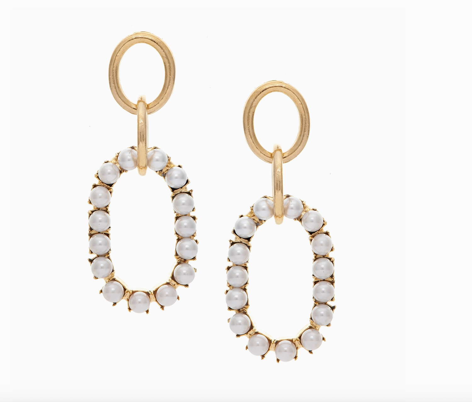 Supremely elegant classic oval earring with pearls and a hanging metal staple. 22K antique gold plated over brass. Hand crafted in New York