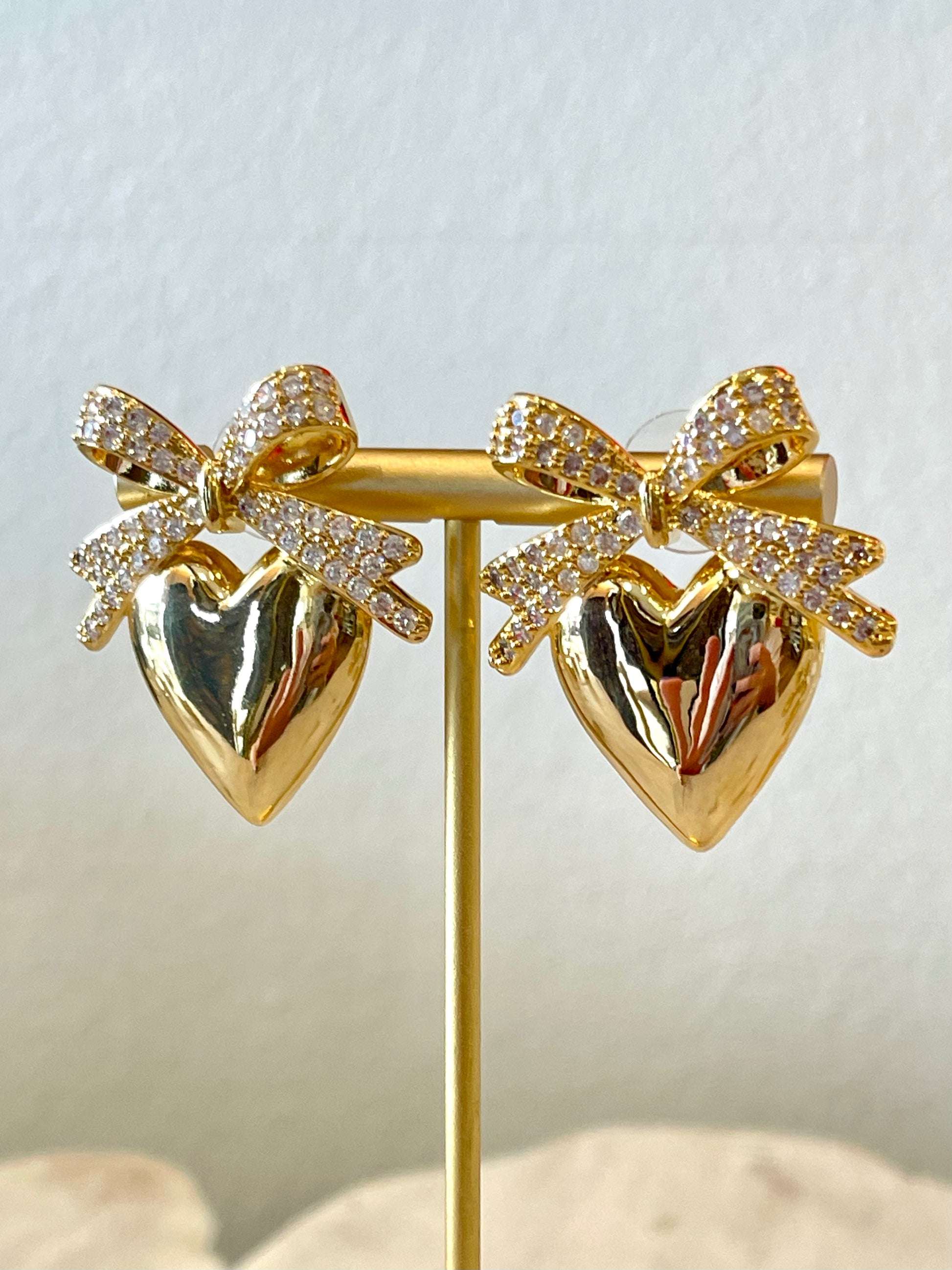 Featuring 18k Gold Plated, gold hearts suspended beneath dazzling, CZ detailed bows, these statement earrings catch the light—and attention—from every angle.