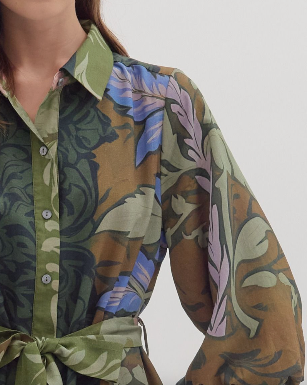 Botanical print long sleeve mini dress featuring button closure at front and removable waist tie belt. Side pockets. Lined. Woven. Non-sheer. Lightweight. 80% Rayon, 20% Nylon.