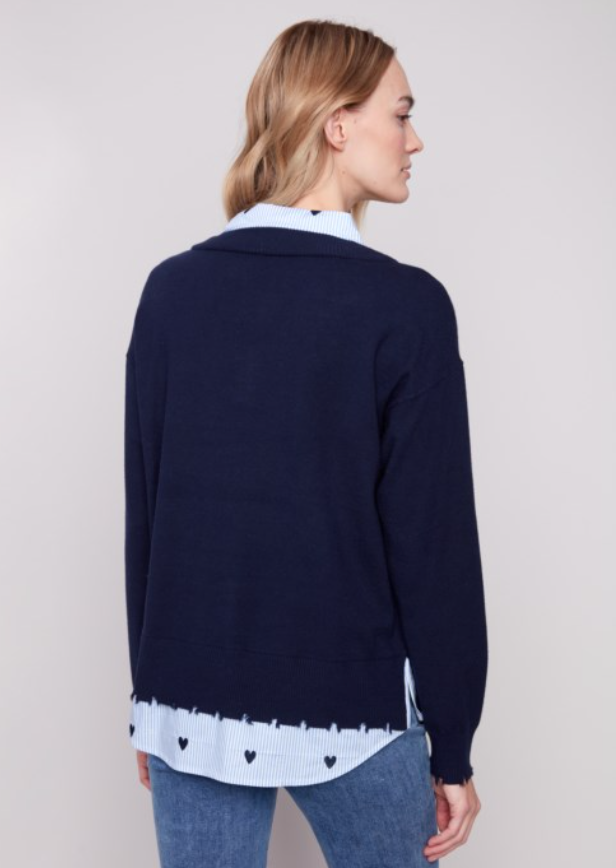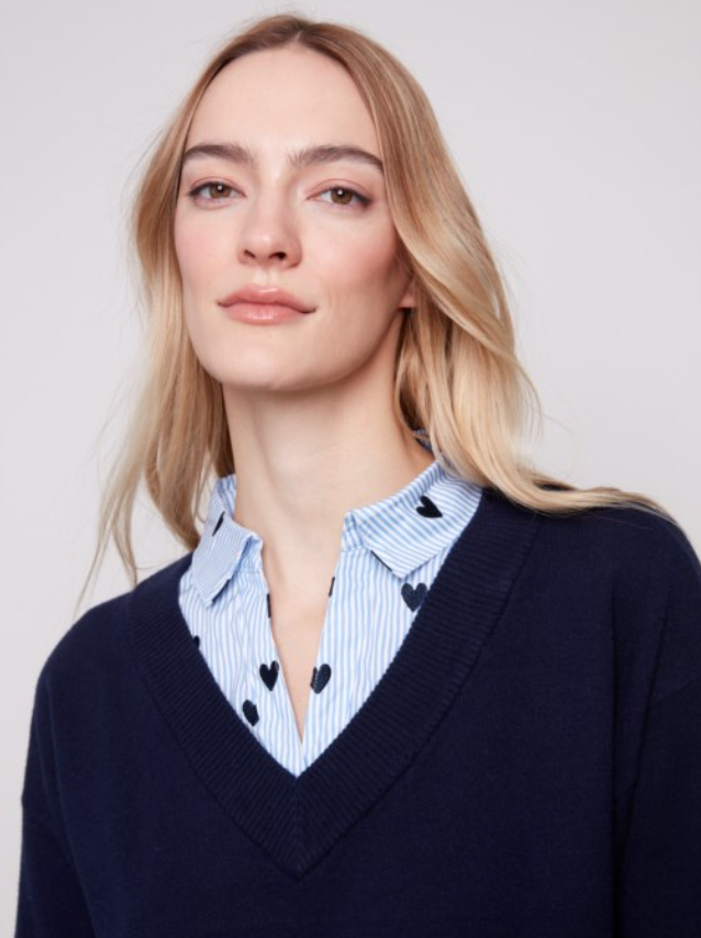 V-Neck Fooler Sweater With Embroidered Poplin Shirt Collar