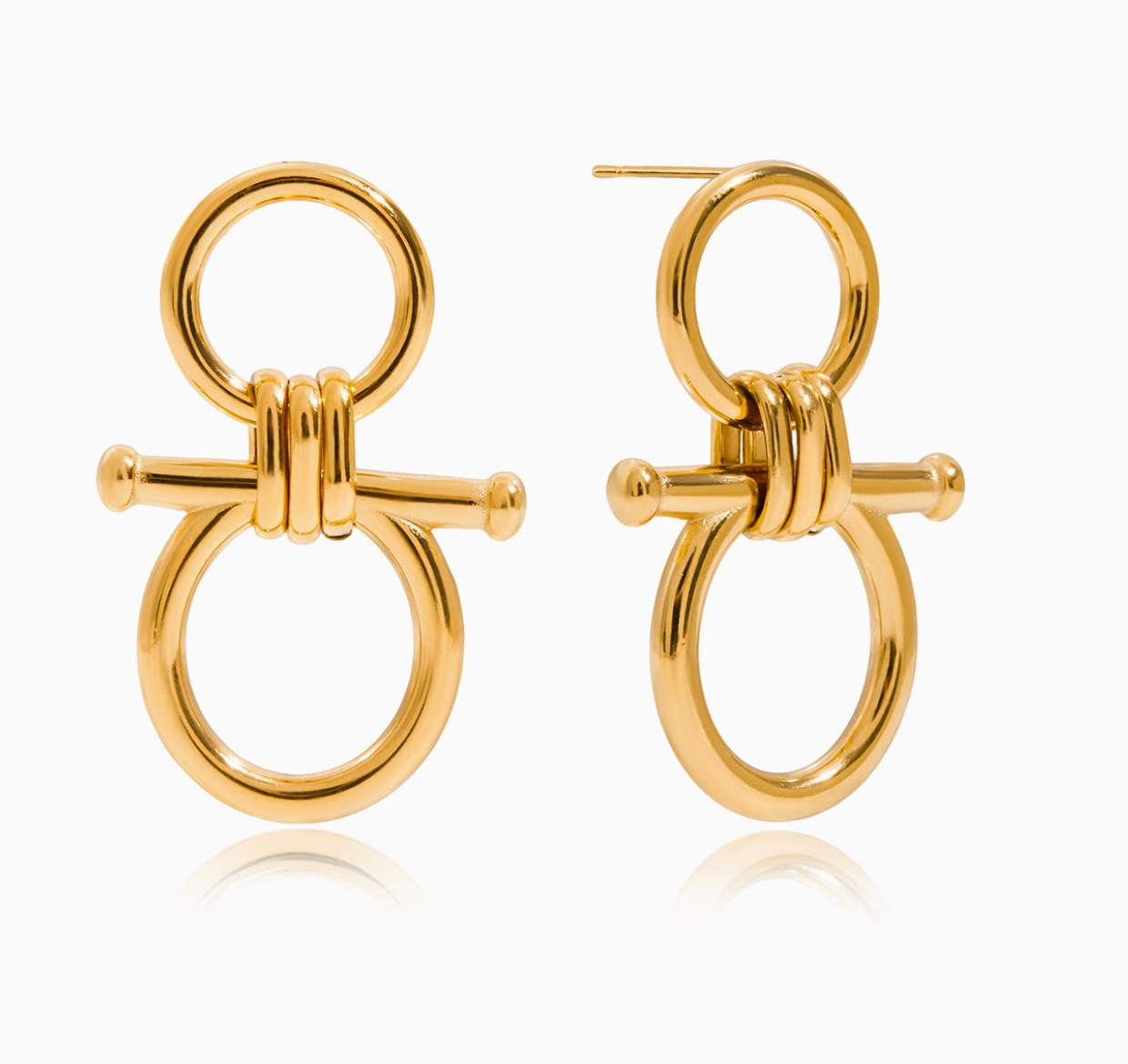 Stainless Steel. Water resistant. Tarnish free. Lead & Nickel free. Sleek toggle-inspired drops with polished loop detailing for a bold, modern finish. Water-resistant. Also Known as a horse bit equestrian style.