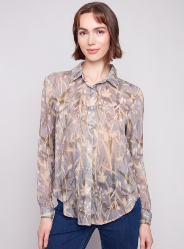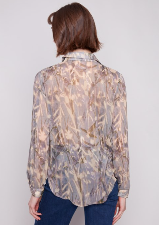 -Printed Chiffon Long Sleeve Button Down Shirt Two Way To Wear, with or Without Front Tie