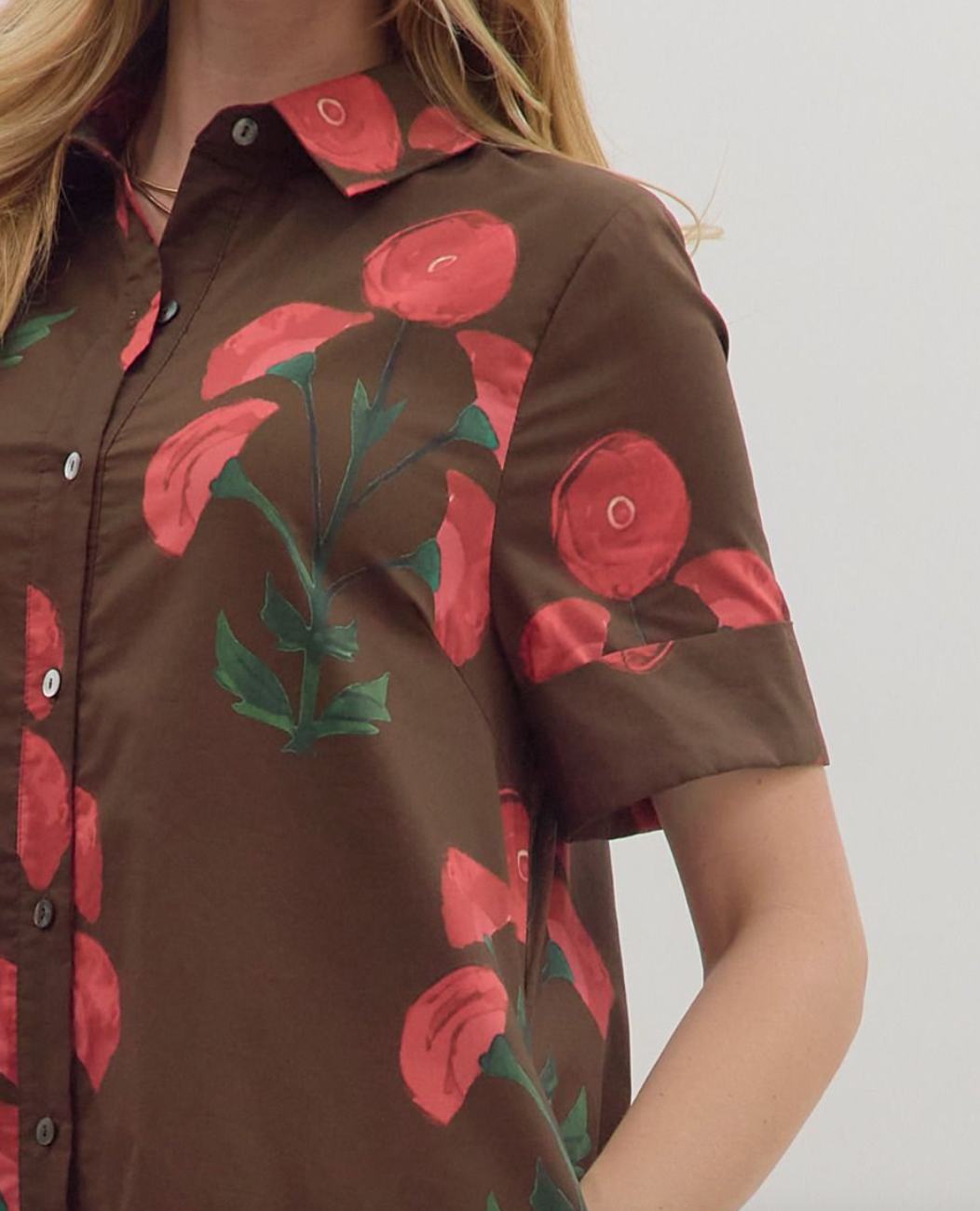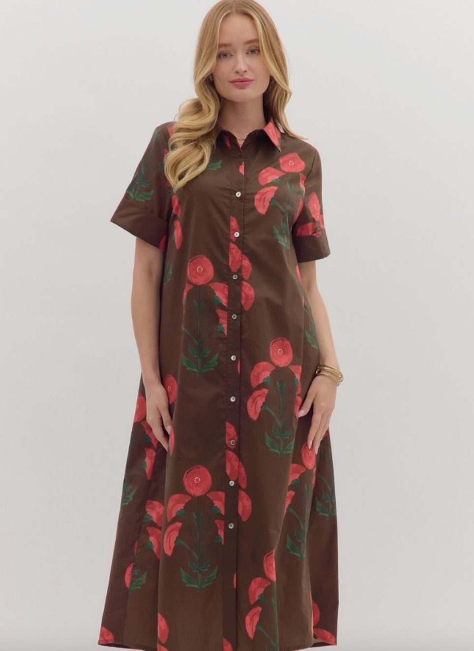 Floral print short sleeve midi dress featuring button closure at front. Side pockets. Lined. Woven. Non-sheer. Lightweight. 100% Cotton.