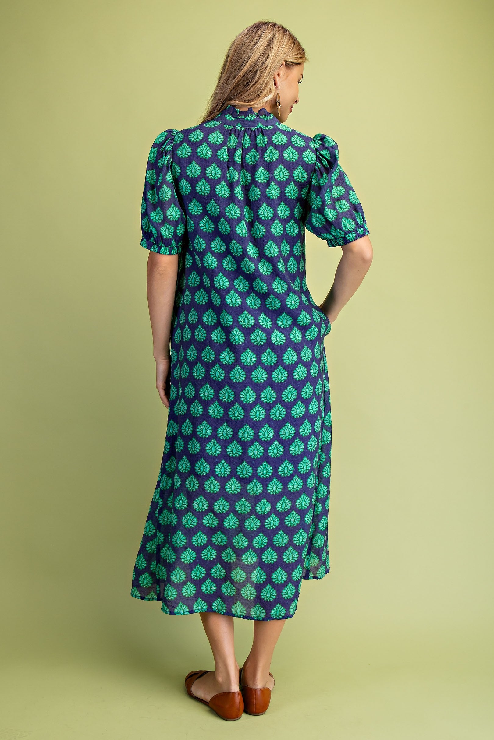 Printed button down midi dress with a ruffled collar and elastic banded arms. The dress is lined. 70% rayon, 30% polyester.