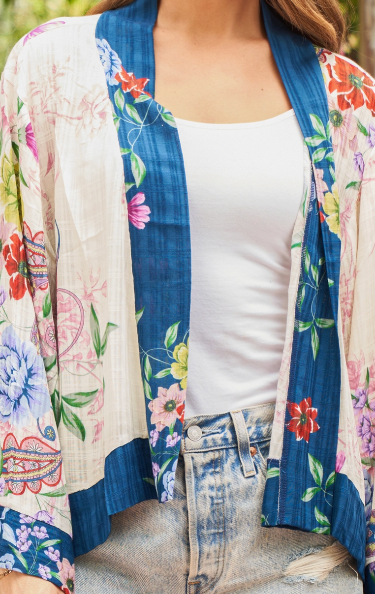 This floral paisley open-front jacket combines a mix of vibrant blooms and intricate paisleys framed with a bold contrast border for a bohemian charm. Lightweight woven fabric with soft, airy texture. Floral and paisley print blend for a whimsical feel. Open-front design with contrast border trim. Relaxed fit with long sleeves for easy layering. Perfect for adding a romantic boho touch to tanks, tees, or dresses. Machine wash. 100% viscose.