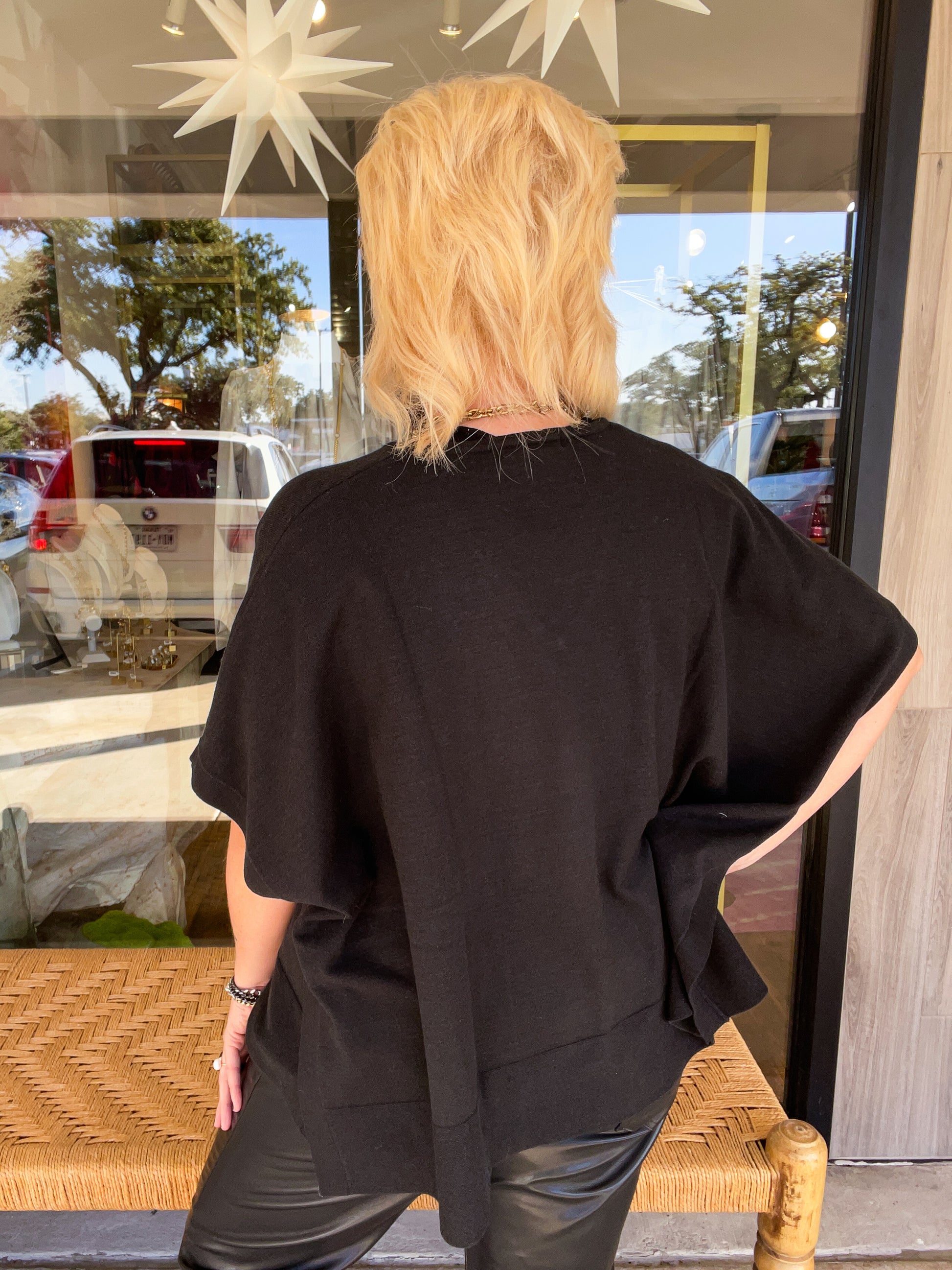 -Drop shoulder, cap sleeve, v-neck and straight hem with side vents for a great layering item.