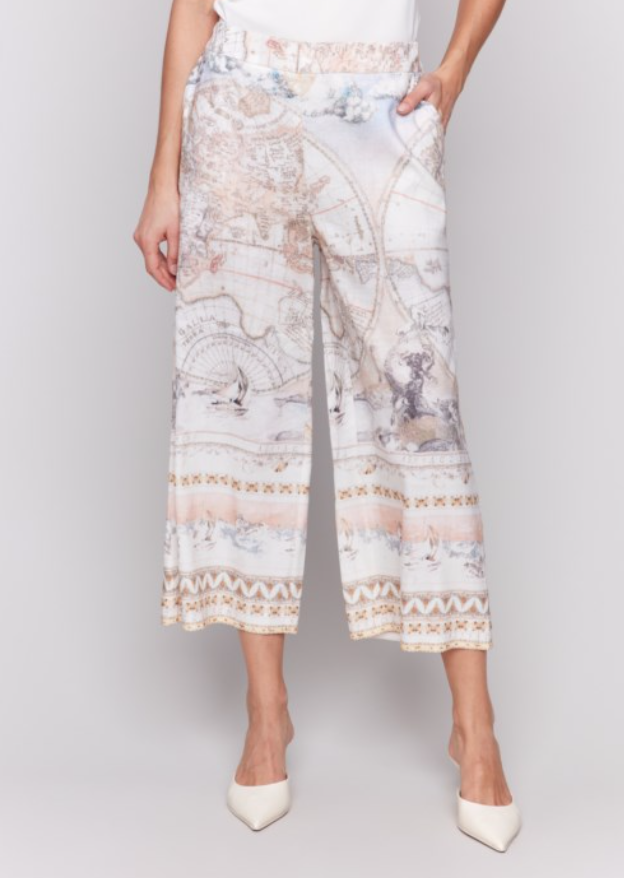 Pull On Position Printed Linen Stretch Pants With Pockets and Elastic At Back Waistband