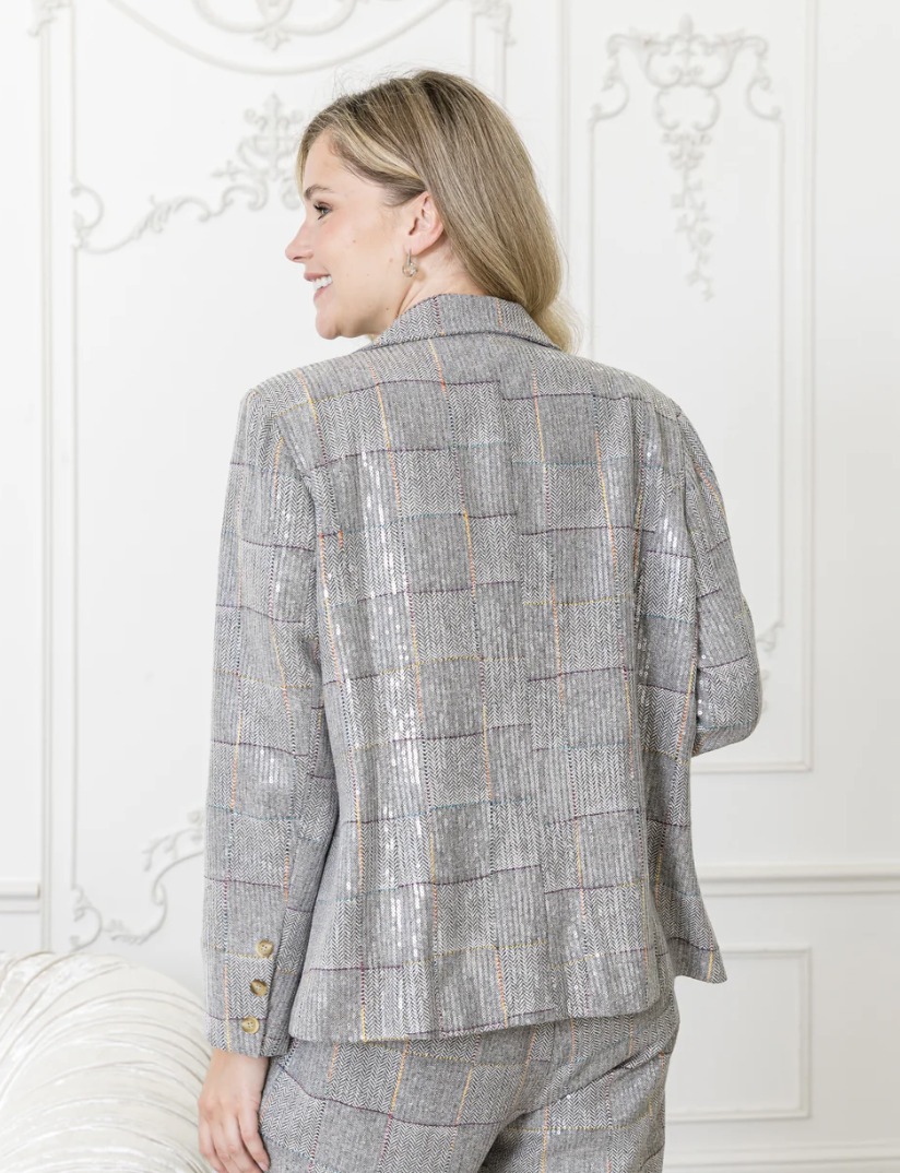 Add some sparkle to your wardrobe with our Jamie sequin blazer jacket. This festive jacket features a trendy plaid print with sparkling sequin. Complete the ensemble with our matching Juriko Pant. Stylish and timeless.