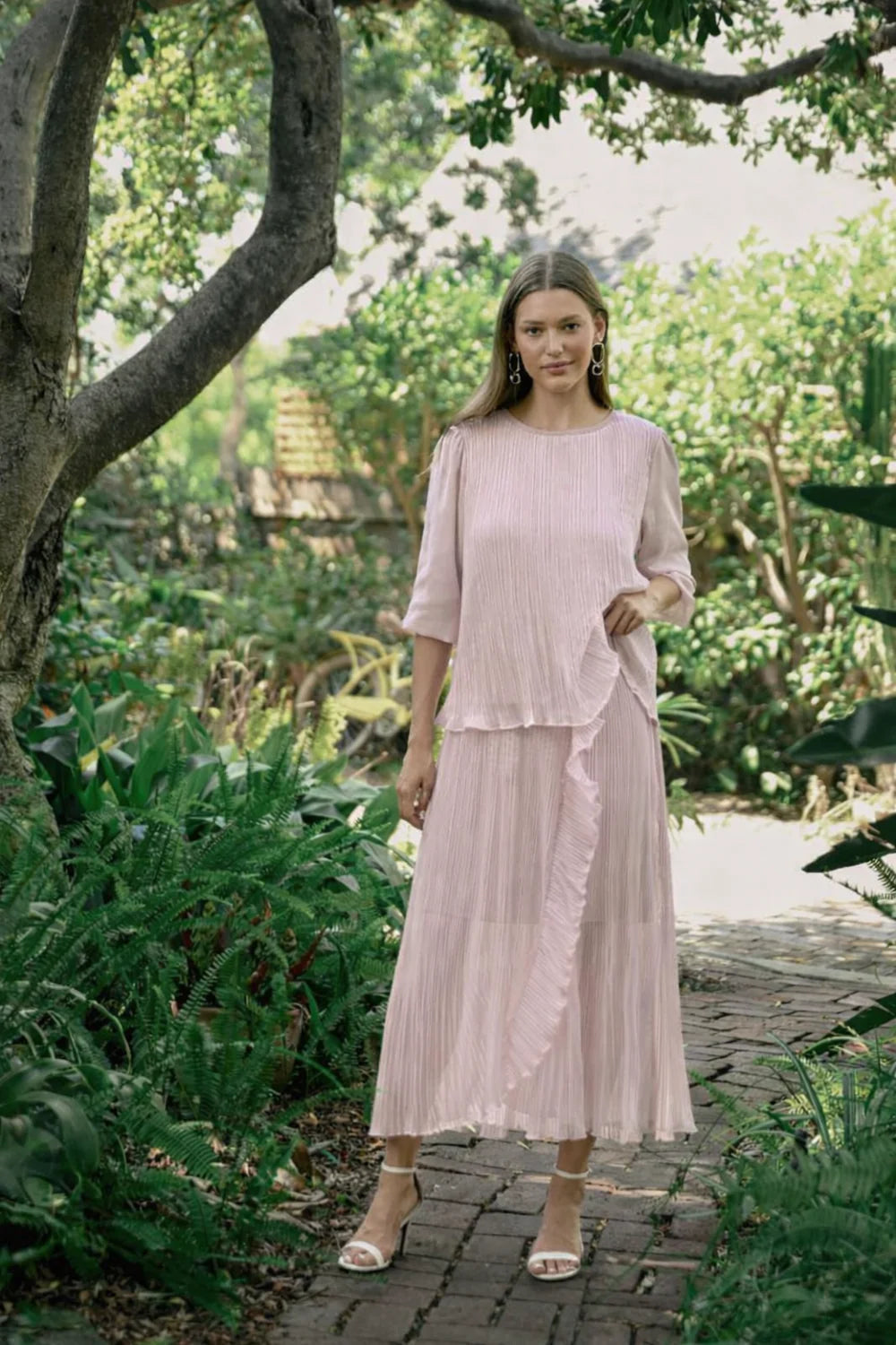 The Jana Skirt is soft and feminine, this midi skirt features lightweight pleated sheer woven fabric with a flattering smocked waist and an asymmetrical ruffle detail. Designed with a flowy silhouette and a leg slit for easy movement, it’s perfect for effortless day-to-evening wear.