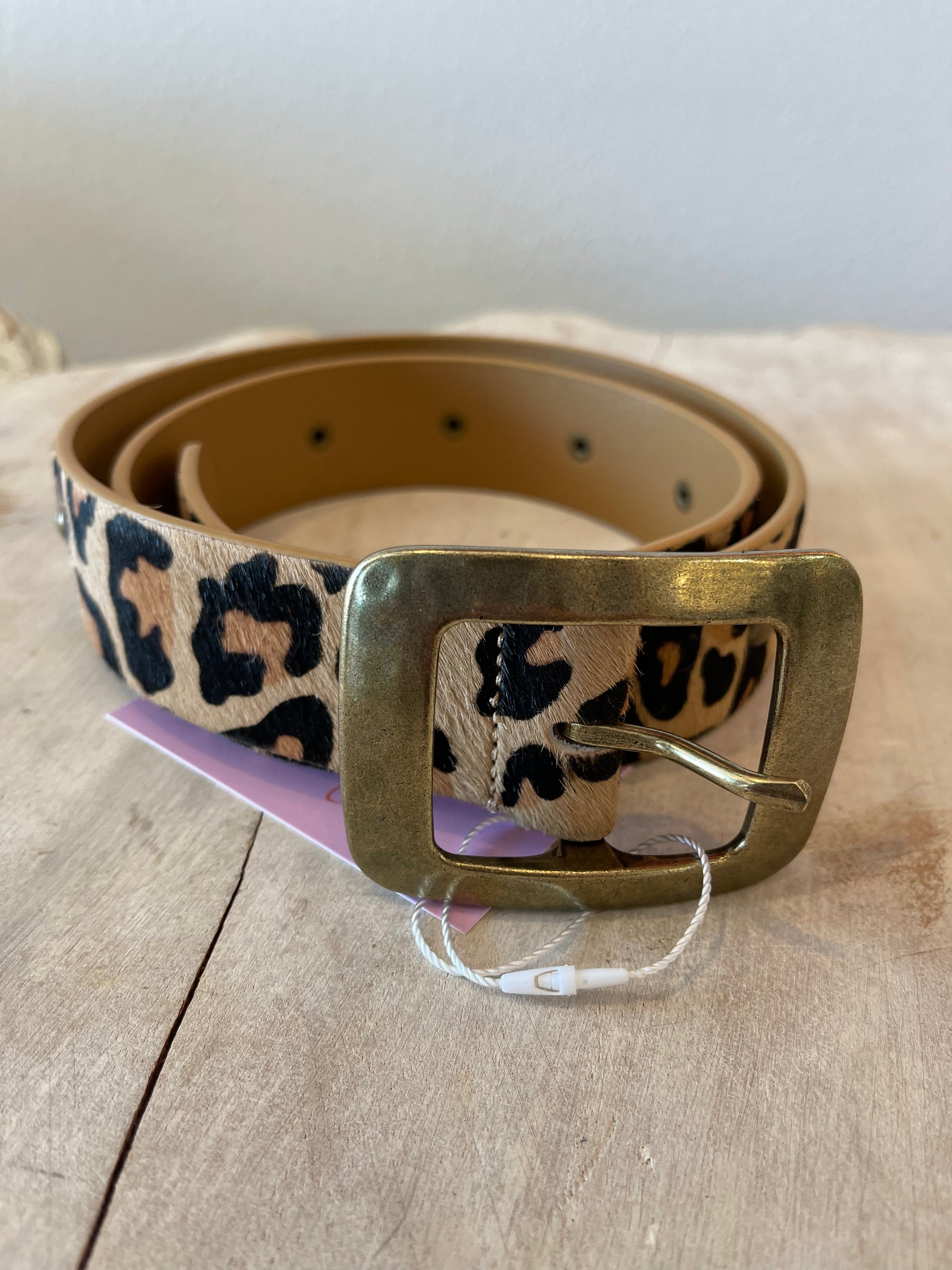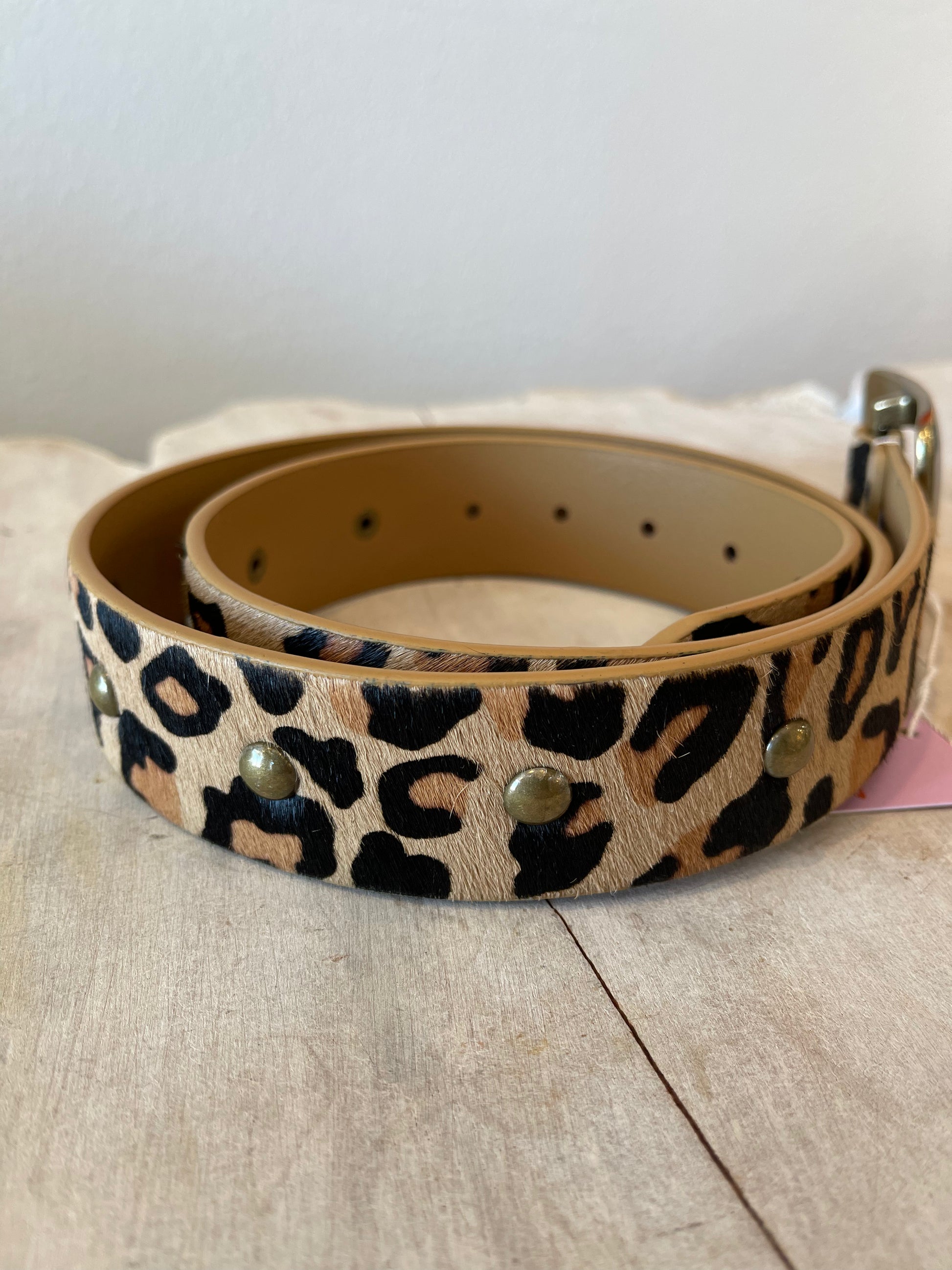 A timeless leopard print on hide and genuine leather. Aged brass grommet detailing. Gorgeous gold statement buckle. 1.38" wide.