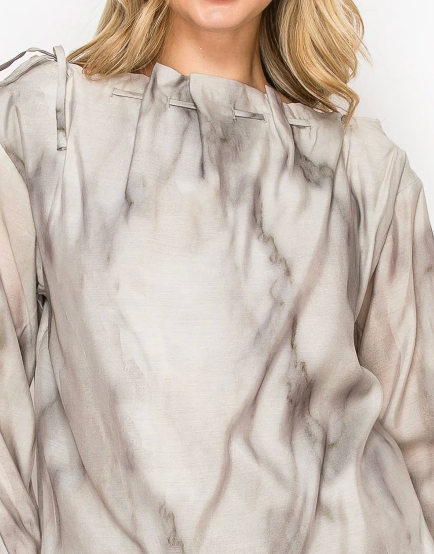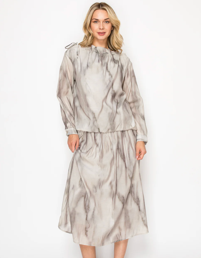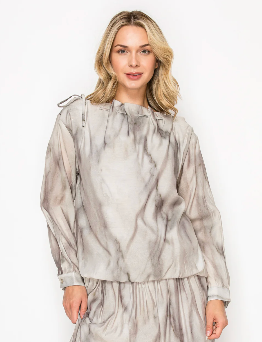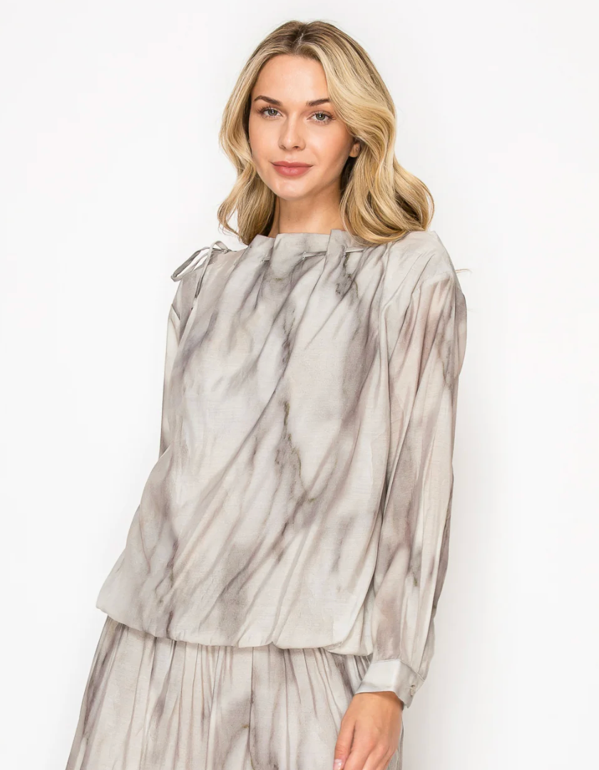 The Jeremiah. Beautifully made with lightweight, flowy woven fabric. Perfect for all seasons print. Adjustable gathered braided neckline. Long sleeves. Bubbled bottom. Such a soft feminine look. Style together with the matching Jeanelle Skirt.