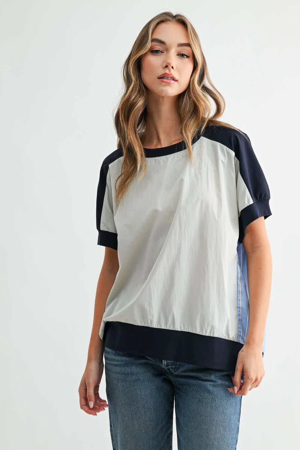 The Joy top is a beautiful mixed-media top combines soft heather grey knit with a lightweight khaki front and a blue striped back panel for a unique, relaxed look. Designed with rolled short sleeves and a comfortable loose fit, it’s an easy everyday piece with modern, sporty style.