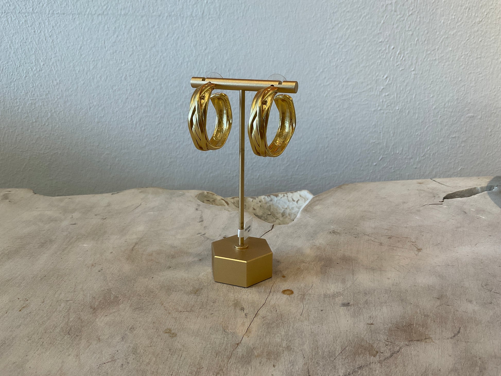 Ribbon overlap mid size hoop Materials: Pewter plated with 24 kt gold / Sterling silver / Rose gold. Measurements: 1.5" wide Earring closure: French wire Medium weight: 0.48 oz