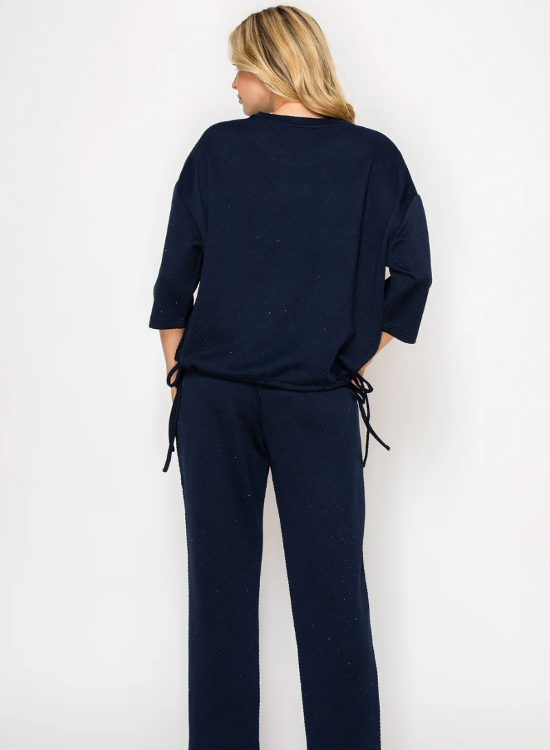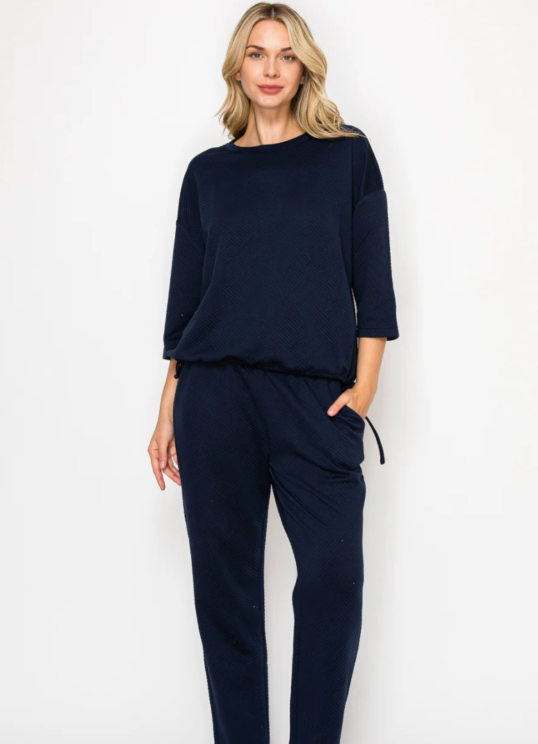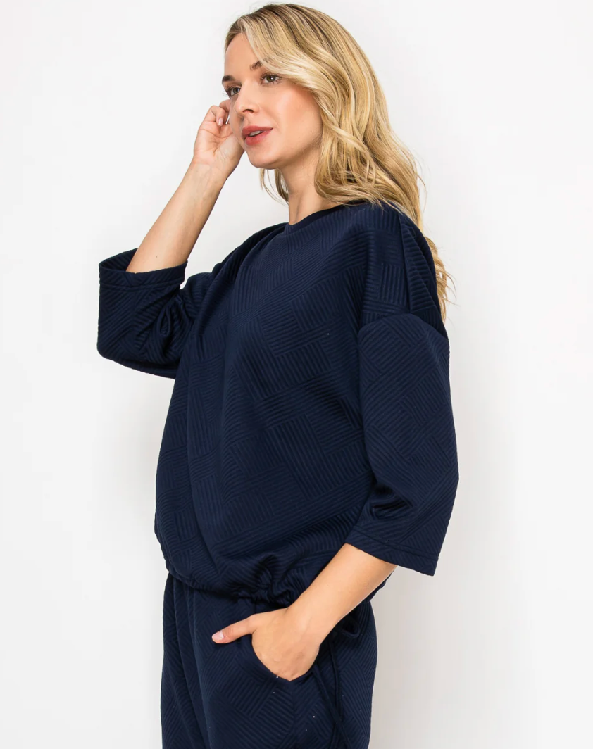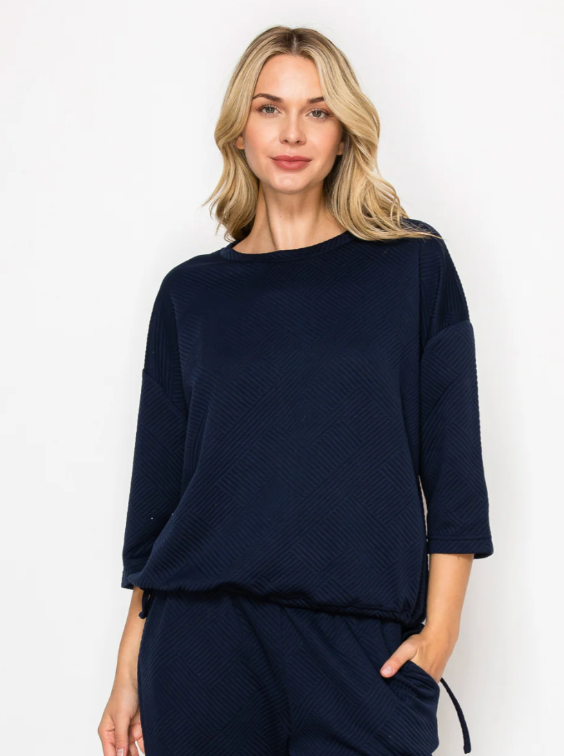 Comfortable and casual top made with high quality textured stretch knit. Round neck. Three quarter length sleeves. Adjust and cinch the bottom with the functional drawstring hem. Perfect everyday wear. Ankle length pant. Elastic waist for the utmost comfort. Side pockets.