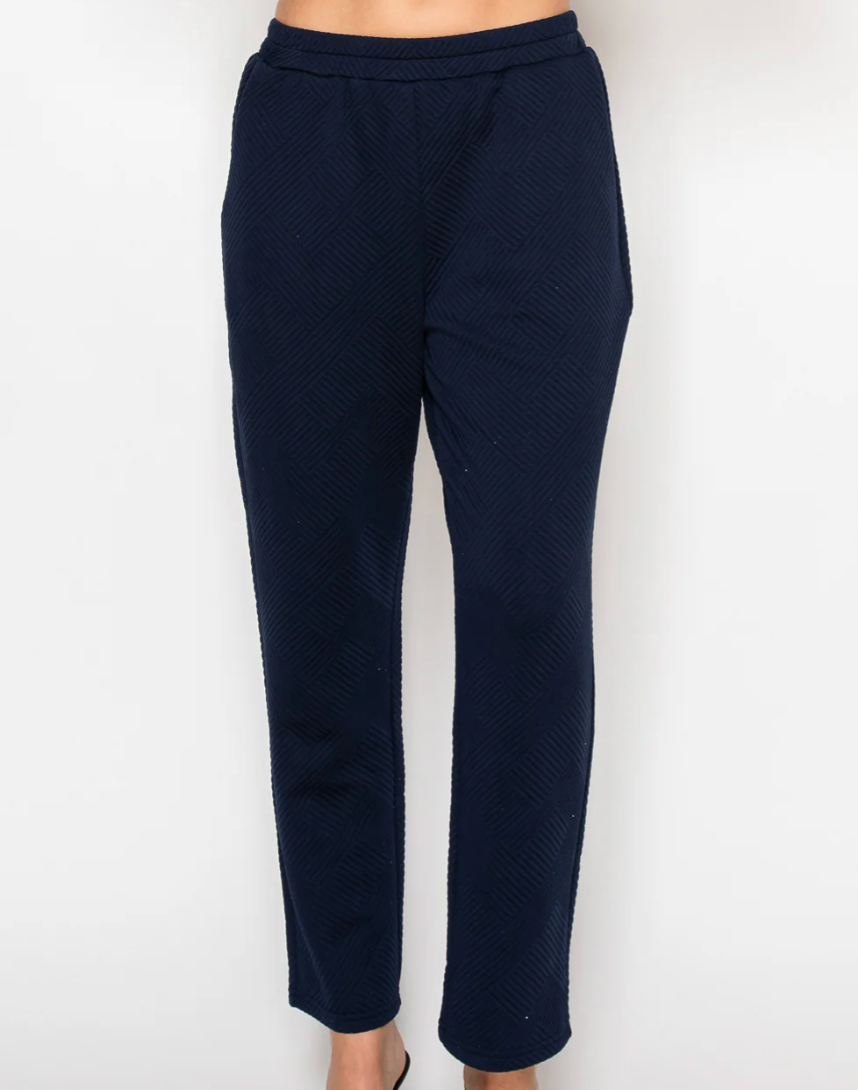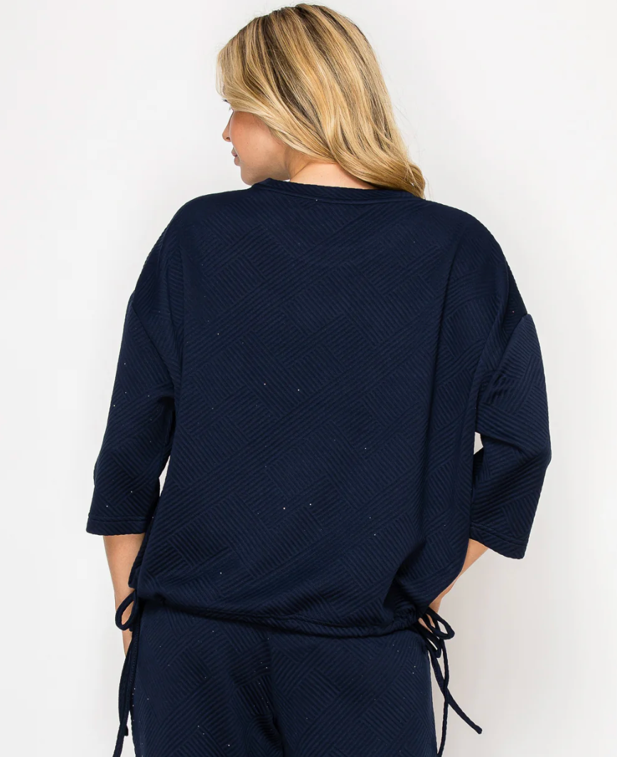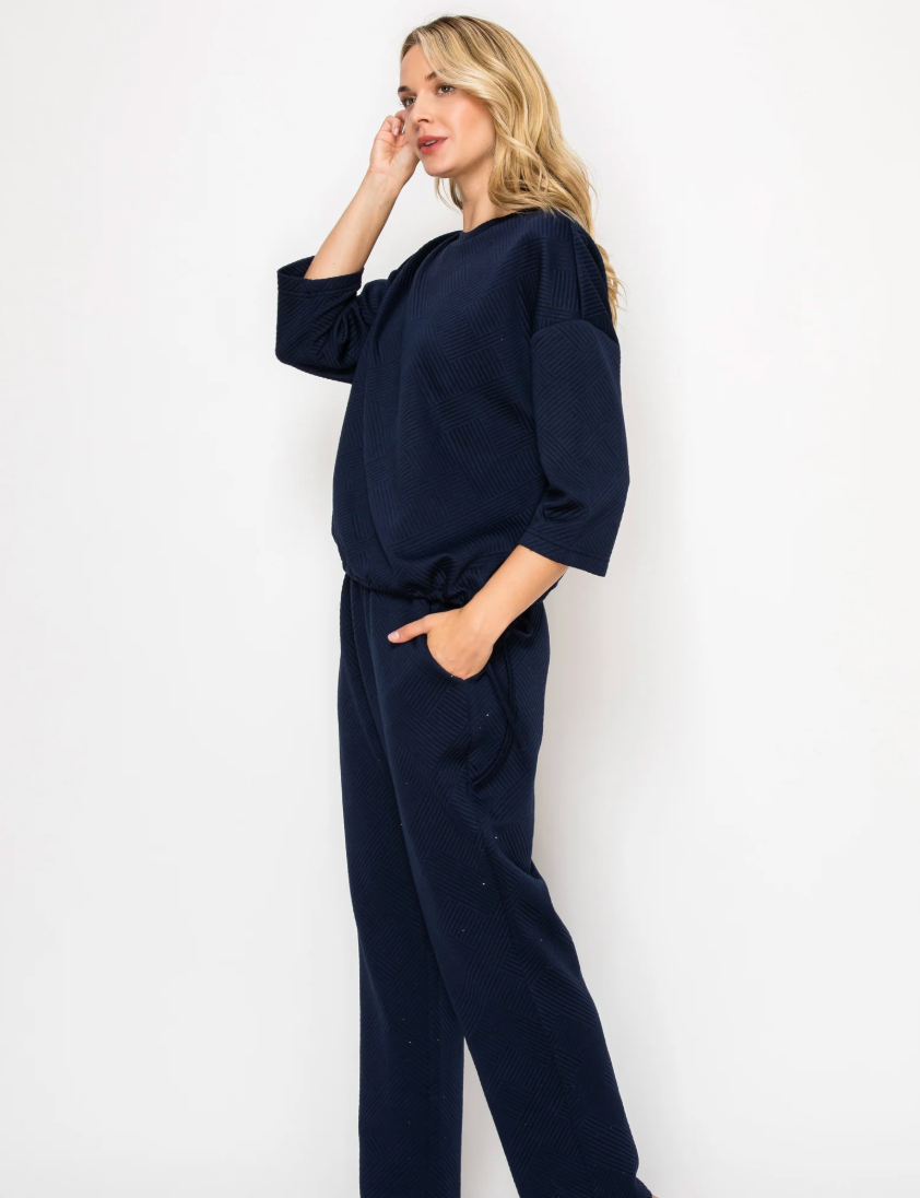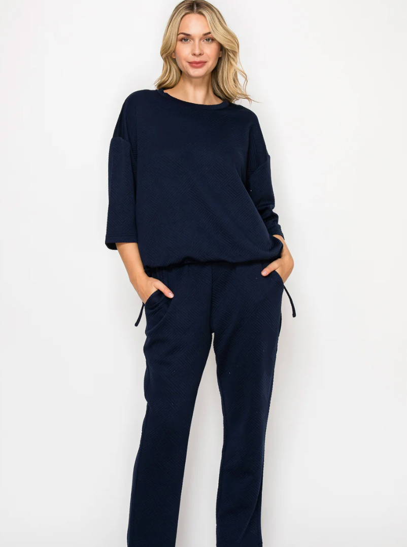 Comfortable and casual top made with high quality textured stretch knit. Round neck. Three quarter length sleeves. Adjust and cinch the bottom with the functional drawstring hem. Perfect everyday wear. Ankle length pant. Elastic waist for the utmost comfort. Side pockets.