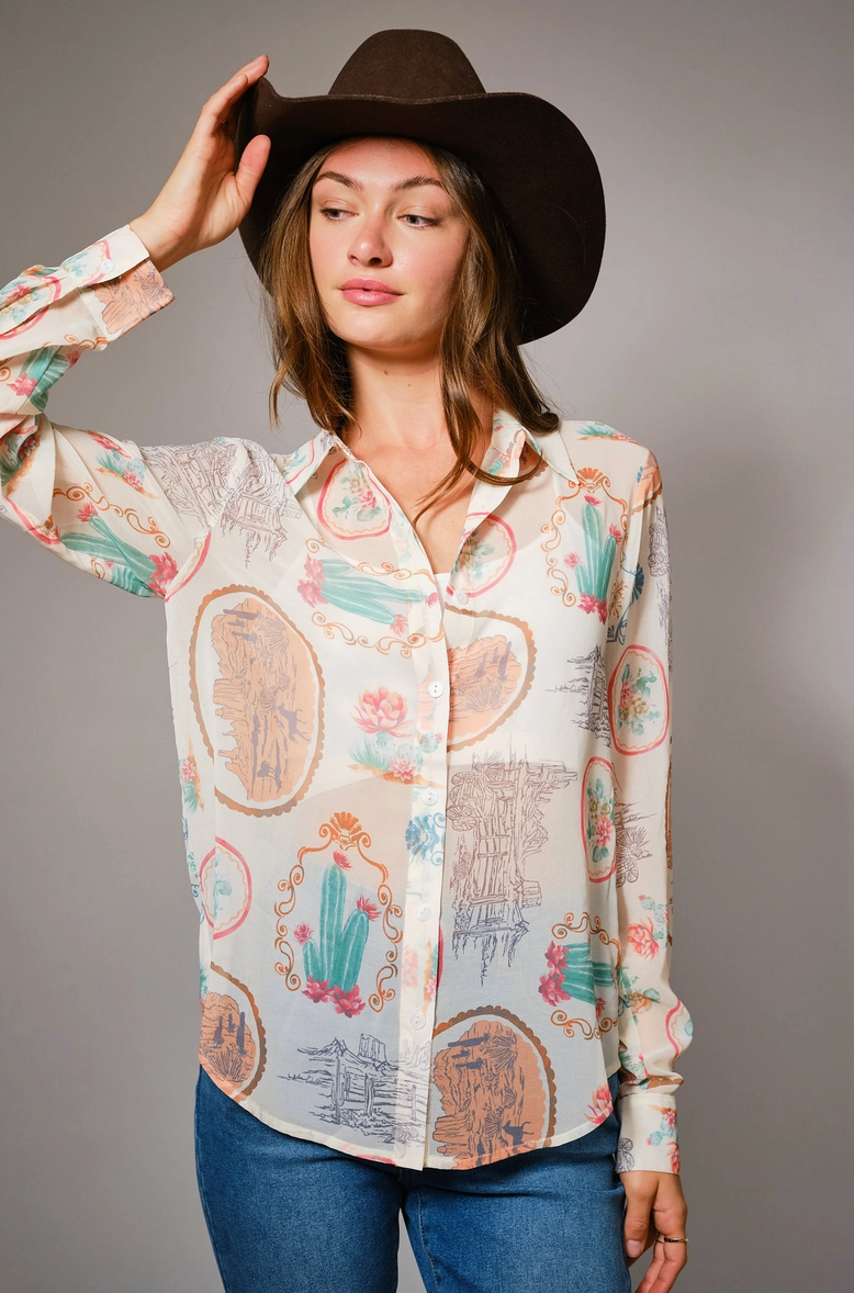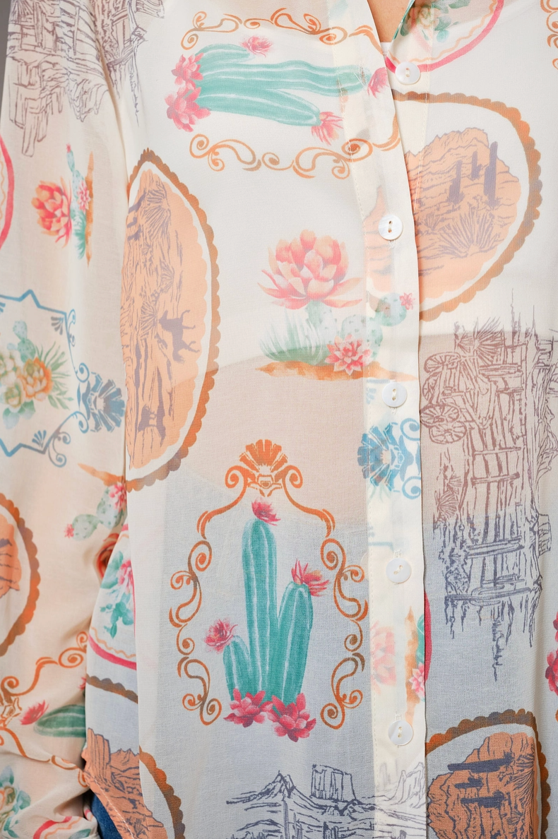 Relaxed fit chiffon button-up shirt with western-inspired postcard illustrations in soft pastel tones. 100% polyester.