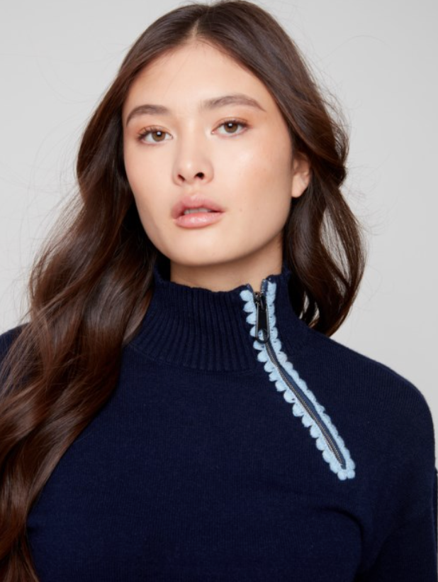 Mock Neck Sweater With Zipper And Contrast Crochet Detail
