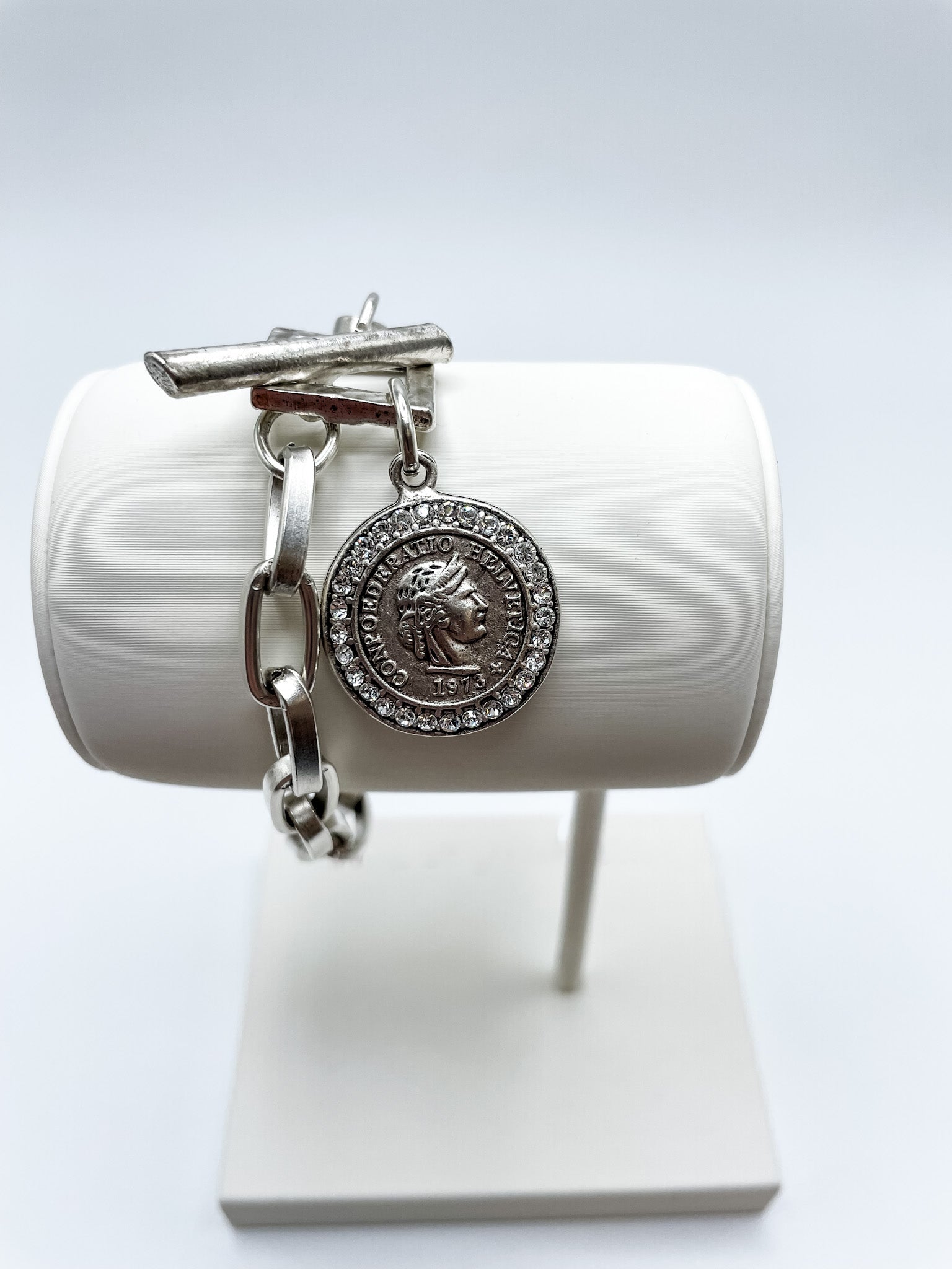 Single vintage inspired Roman coin with crystals and double coiled chain. Along with a unique bar and square toggle. 22K antique gold plated over brass. Hand crafted in New York