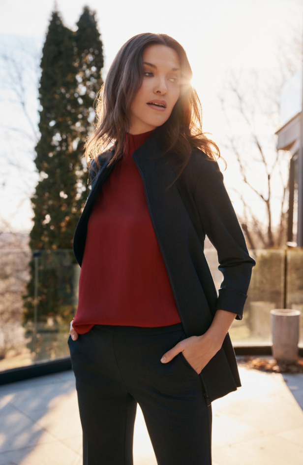 Sleeveless top in Renuar’s signature air flow fabric and a ribbed mock neck. This is perfect for underneath a blazer or cardigan.