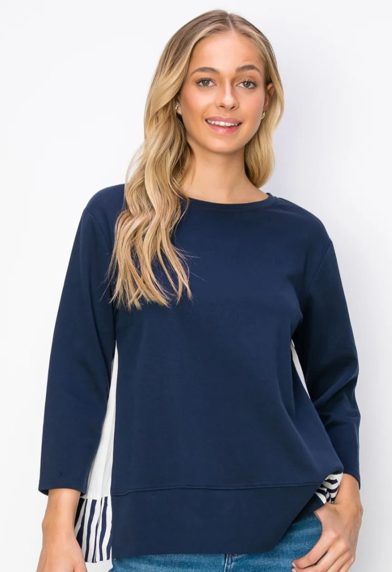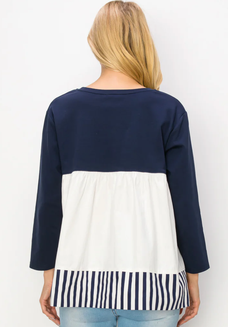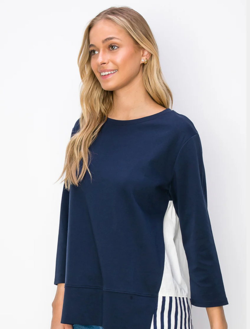 The Regina top. Made with high quality pointe knit. The back is mixed with cotton poplin stripe. Round neck, long sleeves, and slightly ruffled back. Easy relax fit. Perfect everyday wear.