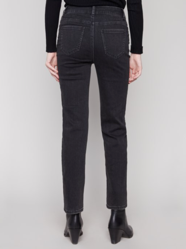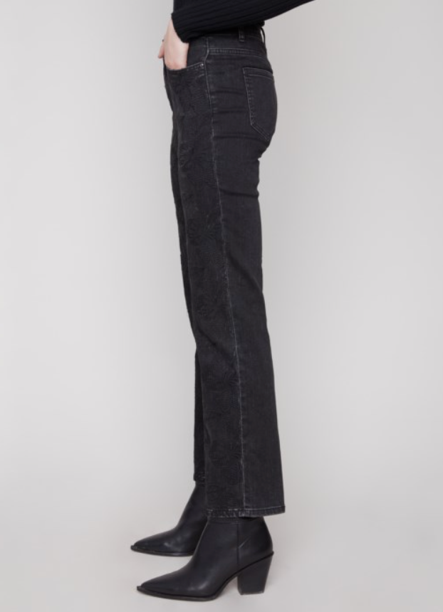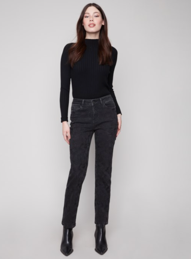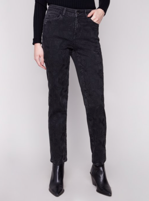 Straight Leg Stretch Denim Pants With Allover Tonal Embroidery
