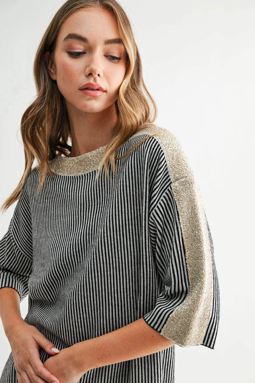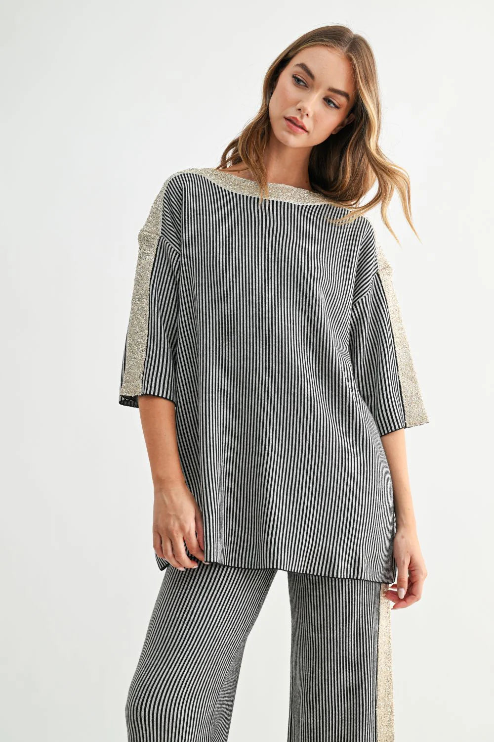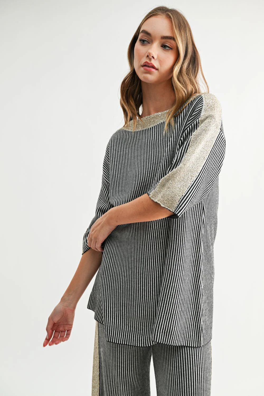 Elevate your everyday look with the Simone Top. This chic striped knit top, accented with a shimmering gold detail along the neckline and sleeves. Designed with a relaxed silhouette and elbow-length sleeves, it offers effortless style with a touch of sparkle. Perfect for dressing up or down, this top adds a modern, polished feel to any outfit.