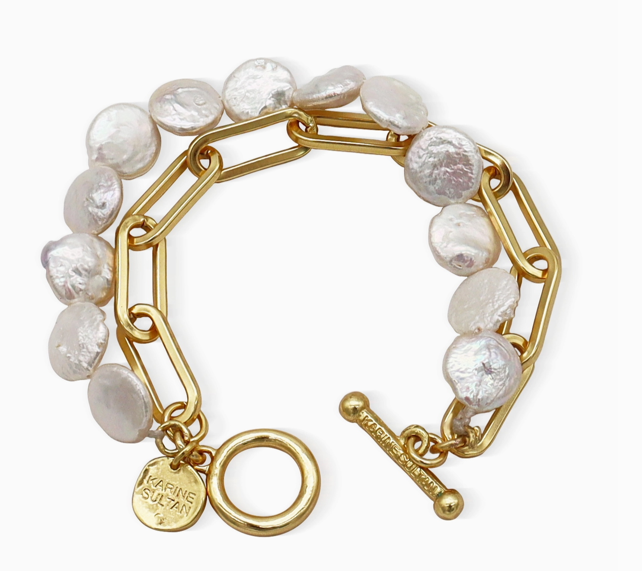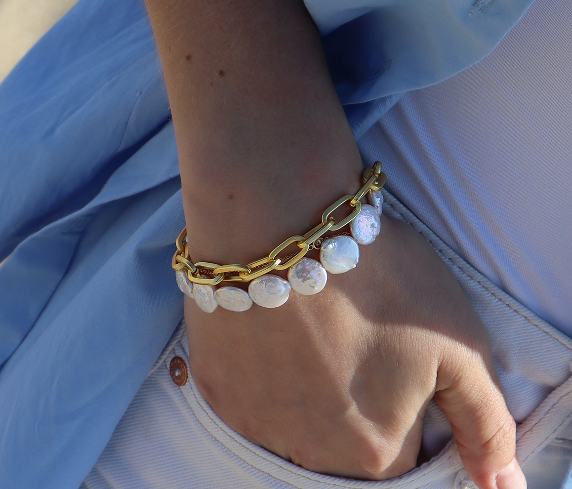 Dive into summer elegance with our Tide and Gold bracelet, featuring a delicate row of shimmering freshwater pearls paired perfectly with a sleek gold paperclip chain. This stunning dual-row design closes securely with a stylish toggle clasp, blending timeless charm with modern edge. A radiant addition to our Summer Collection, it’s the perfect accessory to carry the effortless spirit of sunlit tides wherever you go. PRODUCT DETAILS: Materials: Pewter plated with 24 kt gold - Freshwater Pearls Measurements: 7" long Closure: Toggle clasp