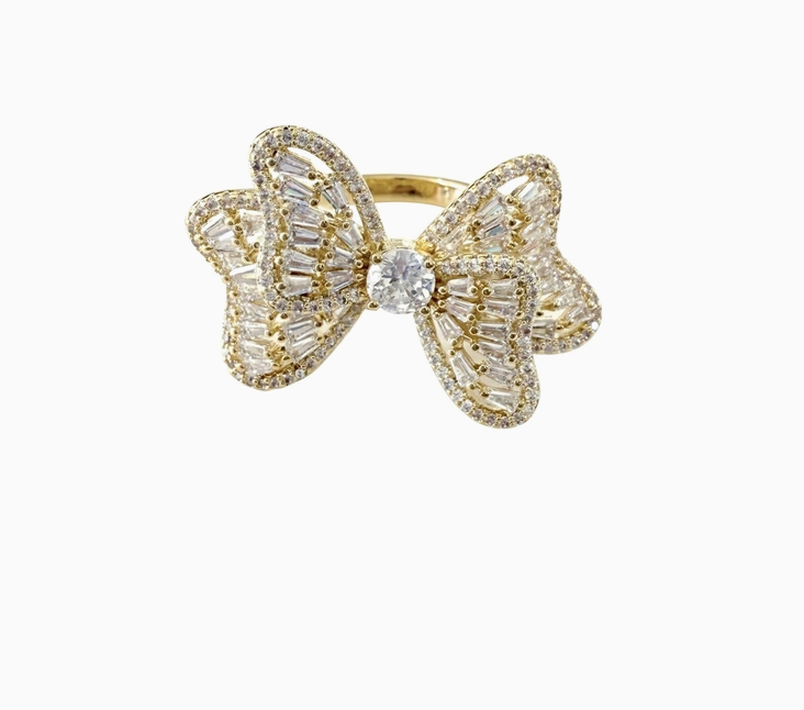 Crafted with 18K gold plating, this charming ring features a delicate bow design accented with shimmering cubic zirconia for a feminine and elegant finish.