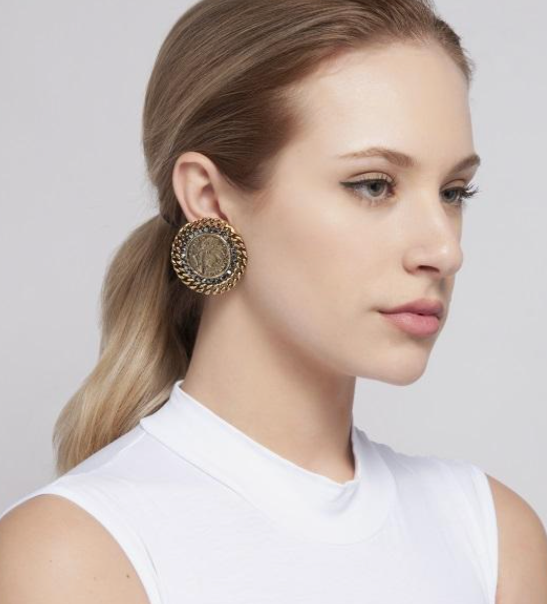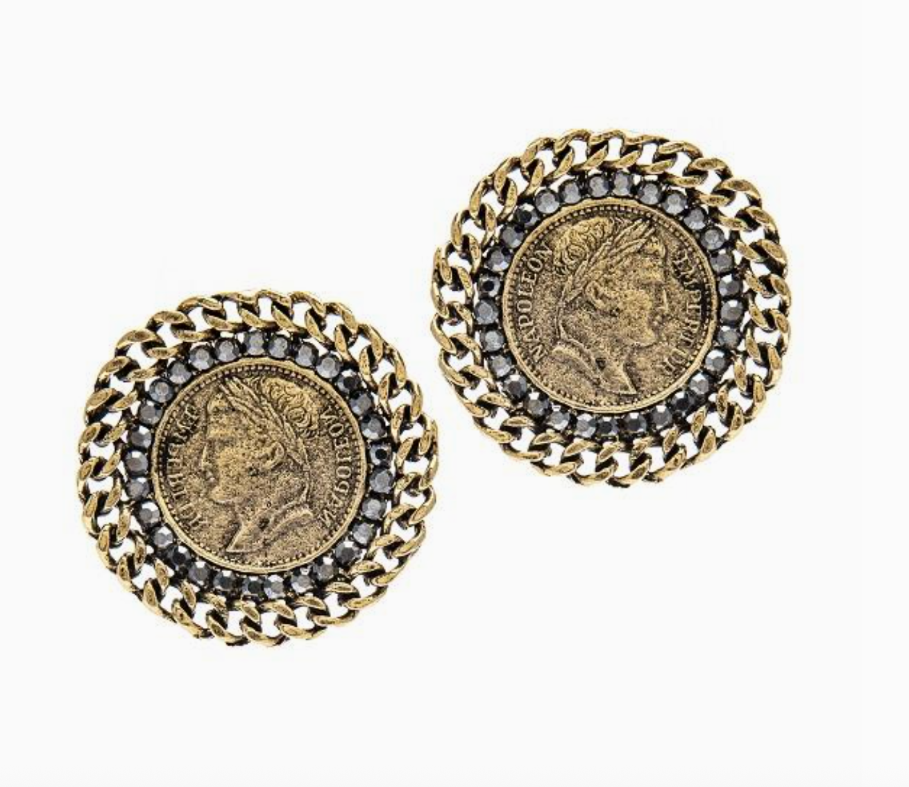 Vintage inspired for a signature one-of-a-kind aesthetic. Coil chain to give a stunning sophisticated look around the the roman coin, and crystals all around. 22K antique gold plated over brass. Hand crafted in New York