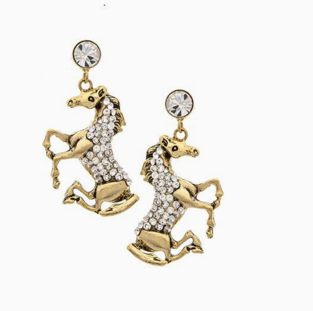 Galloping horse stud earrings with crystals. 22K antique gold plated over brass. Hand crafted in New York.