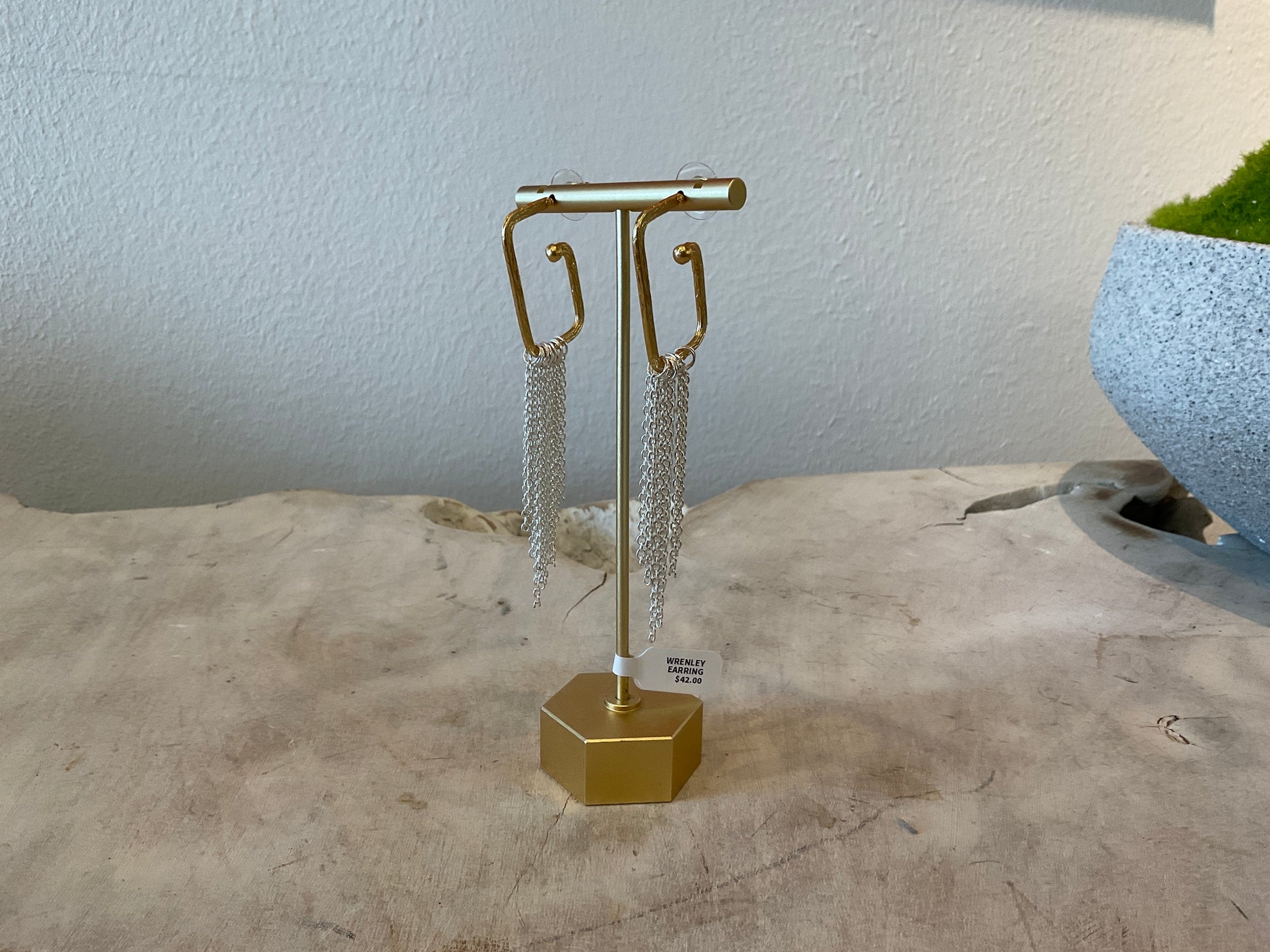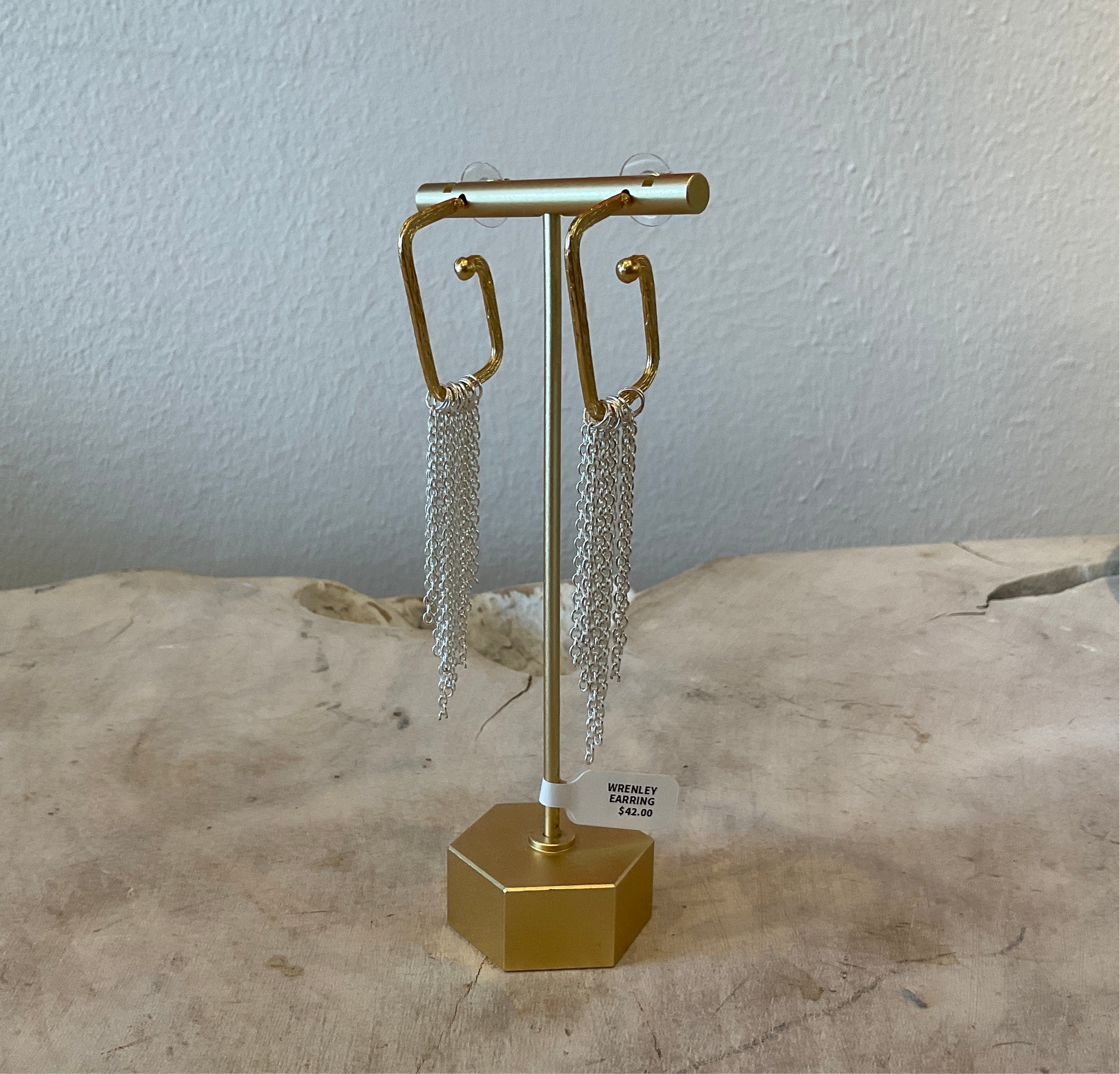 Brushed rectangular earring with simple pearl drop dangle PRODUCT DETAILS Materials: Pewter casting with 24 kt gold plating / Sterling silver plating / Rose gold plating. Faux pearls Measurements: 3.5" diameter Earring closure: Post back